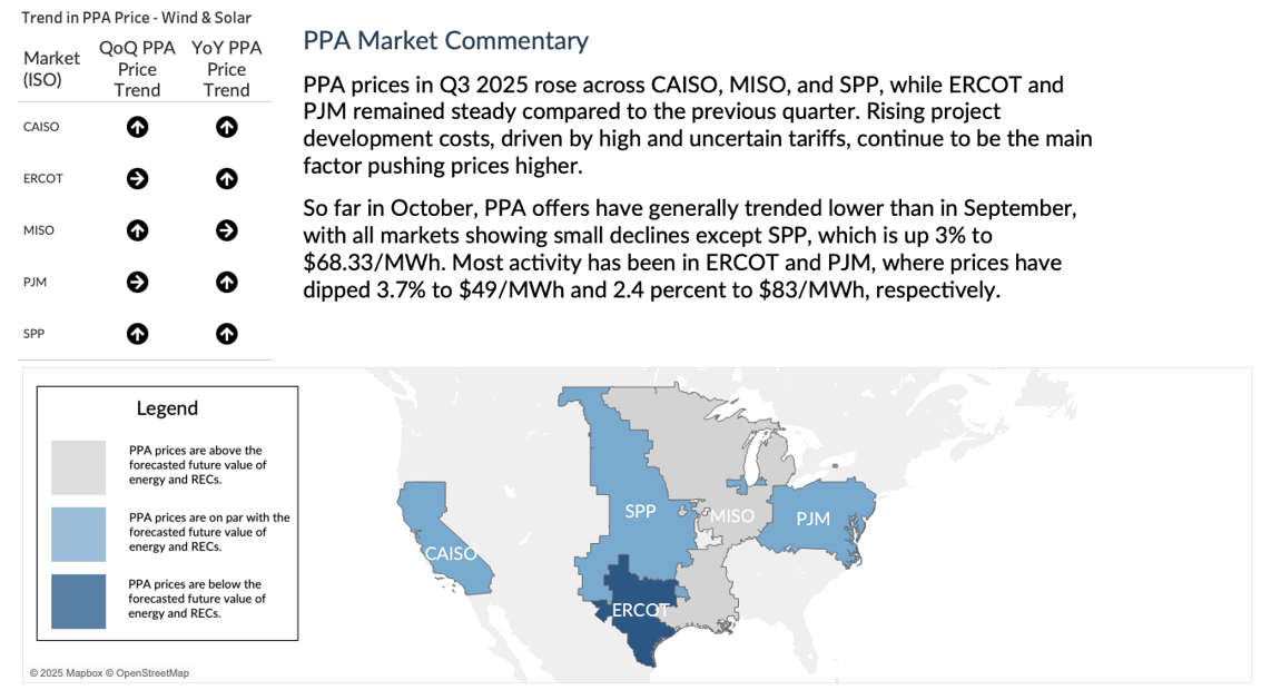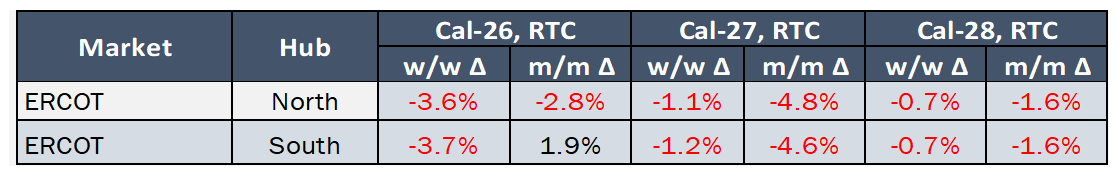 - The Great Lakes Region’s forward power prices were back up again last week after falling the prior week with the tumble in natural gas prices. An over-sold gas market amid bearish market drivers weighed on forward power prices earlier in the month, but colder temperature forecasts along with some short-covering, seemed to provide some uplift to the market of late. A cold front crossing the region will bring below-normal temperatures from the Midwest into the East and South for the second half of this week. The pattern will turn warmer, with above-normal temperatures early next week ahead of a cold front that brings another round of below-normal temperatures eastward. Last week, forward power prices were unchanged for the 2026 term, while the 2027-2030 terms saw a 1% increase. The month-to-date, day-ahead settlement price in COMED for October is $33.67/MWh which is -9% lower than last month while in AdHub that price is $47.09/MWh or 18% higher than last month. In Michigan the October month-to-date settlement price average is currently $40.06/MWh which is 1% higher than September, while Ameren’s settlement price average is $35.28/MWh or -9% lower than last month.