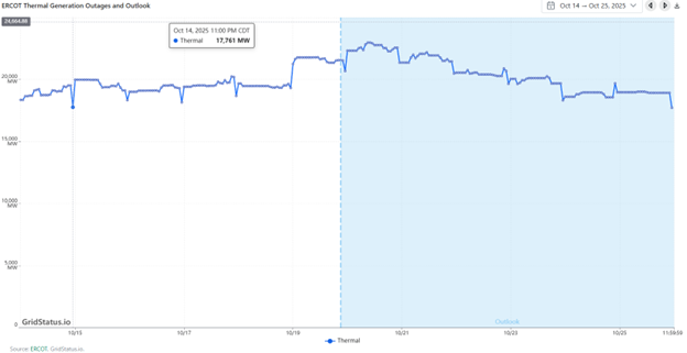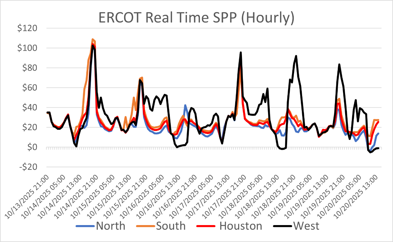 - The Mid-Atlantic Region’s forward power prices were back up again last week after falling the prior week with the tumble in natural gas prices. An over-sold gas market amid bearish market drivers weighed on forward power prices earlier in the month, but colder temperature forecasts along with some short-covering by traders, seemed to provide some uplift to the market of late. A cold front crossing the region will bring below-normal temperatures from the Midwest into the East and South for the second half of this week. The pattern will turn warmer, with above-normal temperatures early next week ahead of a cold front that brings another round of below-normal temperatures eastward. Last week, forward power prices were unchanged for the 2026-2027 terms while the 2028-2030 terms saw a 1% increase. The month-to-date, day-ahead settlement price in West Hub for October is $48.47/MWh, which is 17% higher than last month and 37% higher than a year ago.