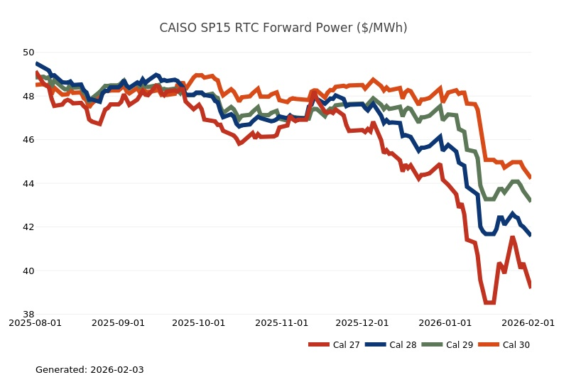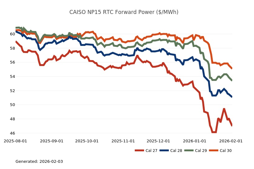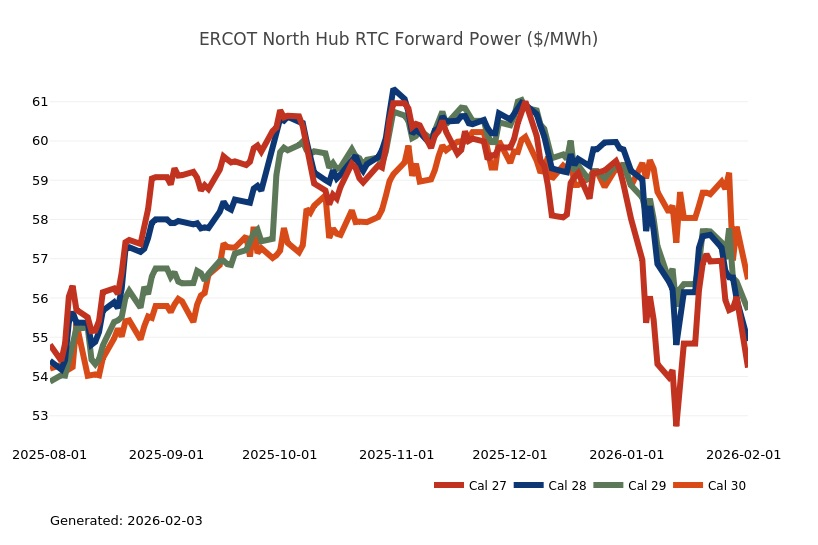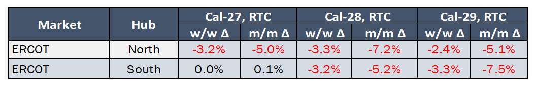 - Henry Hub NYMEX Cal 27-31 strips closed at $3.75/MMBtu (-0.17), $3.64/MMBtu (-0.04), $3.59/MMBtu (-0.03), $3.59/MMBtu (-0.01), $3.60/MMBtu (+0.02), respectively.