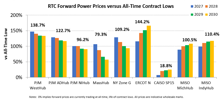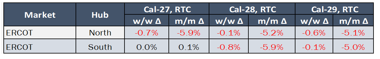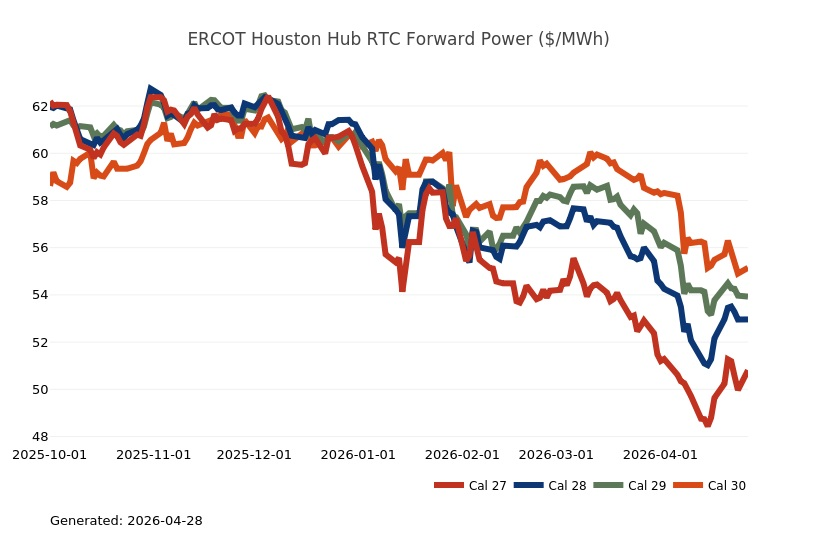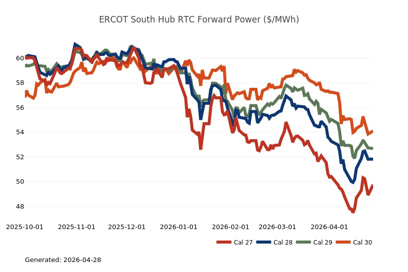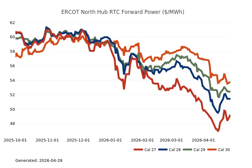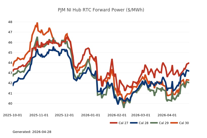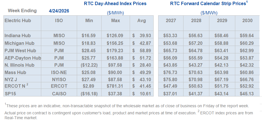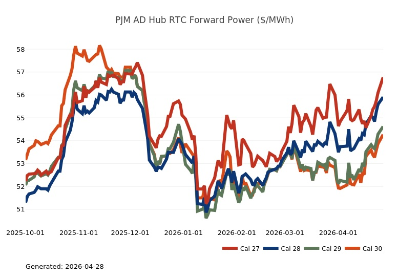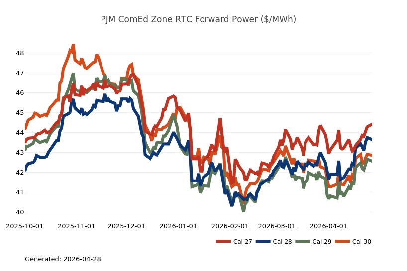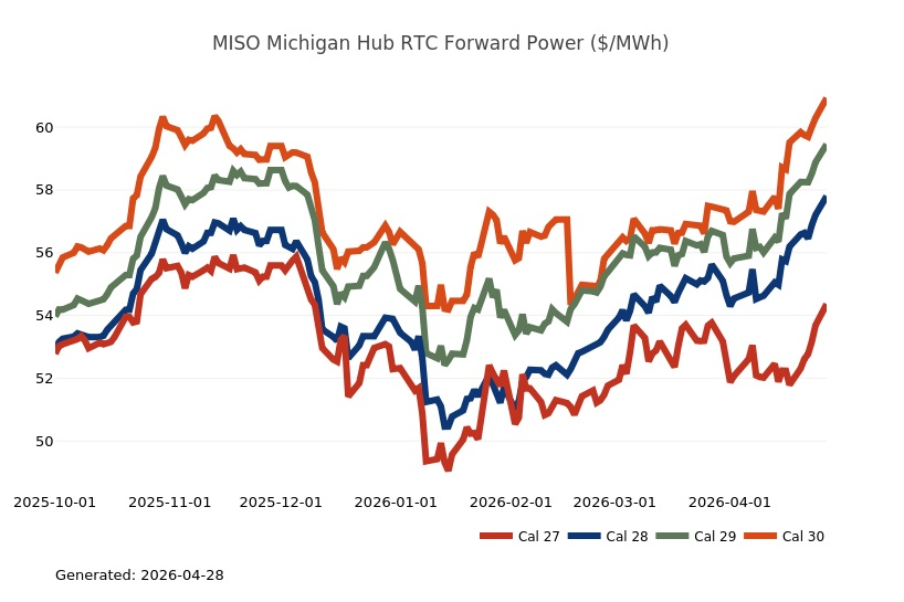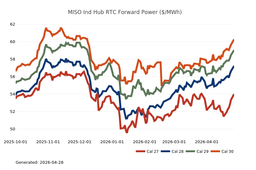- The Great Lakes Region’s forward power prices were higher during the week, despite the seasonal softness in natural gas prices. May NYMEX natural gas extended losses Friday, deepening a storage-driven sell-off as mild weather and swelling supplies pressured the contract in its final days as the prompt month, despite record high LNG exports. We saw cooler changes to the weather forecast over the weekend model runs. Severe weather season is peaking across the central United States over the next few days, as warm air moving up from the South clashes with Canada’s number one export. A strong cold front will move across the eastern half of the nation late this week, bringing another round of chilly air over the weekend. The forward electricity prices for the 2027-2030 strips were 2% higher, on average, over the past week with more support for the near terms than the outer terms. The month-to-date, day-ahead settlement price in COMED is currently averaging $23.73/MWh or -19% lower than March’s final settlement price, while in AdHub that average price for April thus far is $45.35/MWh or 4% higher than last month’s average. In Michigan, the month-to-date average price currently is $40.78/MWh or 3% higher than the March average, while Ameren’s current settlement price average for April is $29.60/MWh or -5% lower than March’s final index average.