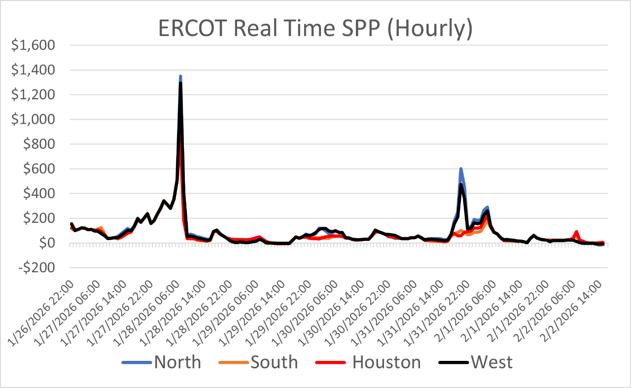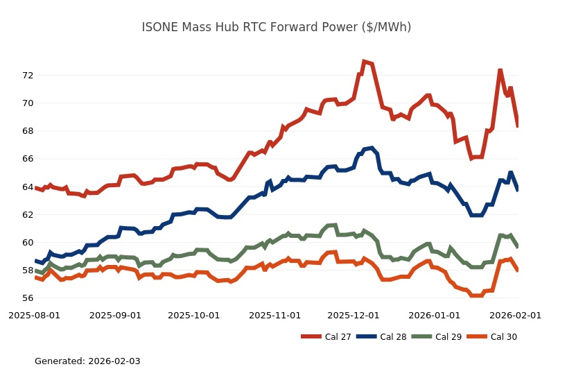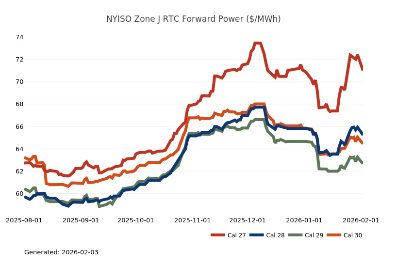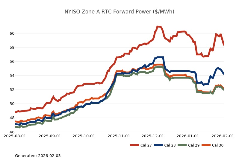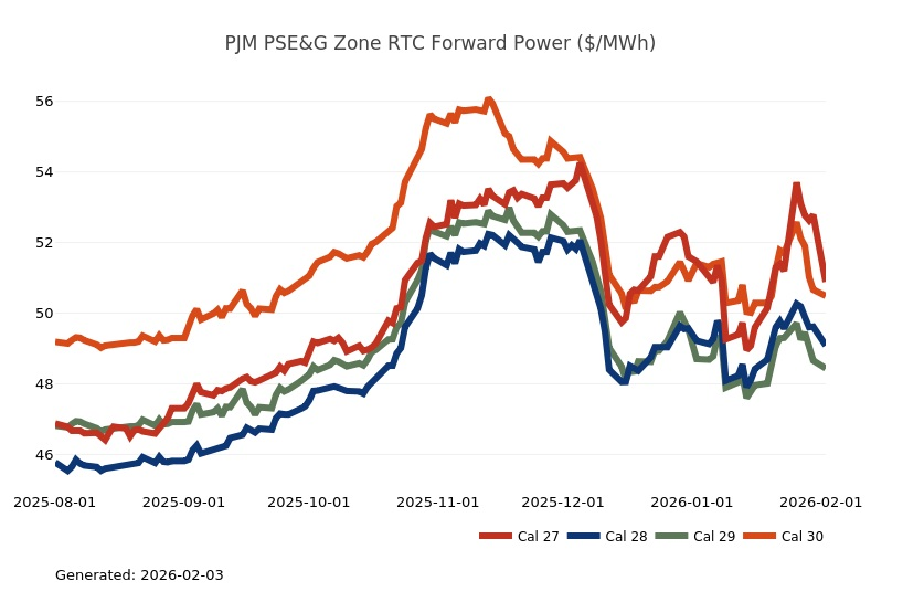 - The Mid-Atlantic Region’s forward power prices were higher on the week, particularly in the near term, as January cold started to provide significant uplift to those terms. March Nymex natural gas futures were up 20% on the week on tight supply and stubborn cold. Shrinking inventories, lingering production freeze-offs and hints of a possible mid-February cold shot fueled impressive gains for natural gas futures on Friday. Conversely, Monday natural gas futures plummeted by more than 25% as the market focused on milder temperature forecasts and production recovering from freeze-offs. Forward power prices for the 2026-2030 terms, last week, were 5% higher with a 15% increase for the balance of 2026 and a 3% increase on the back end of the price curve for 2027-2030. The month-to-date, day-ahead settlement price average in West Hub for February is currently $227.17/MWh. Final settlement prices for January are still pending.