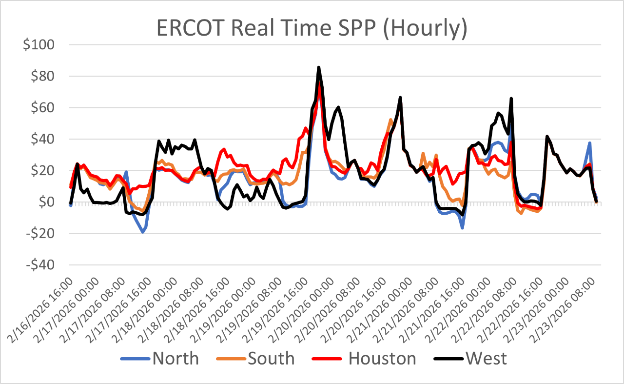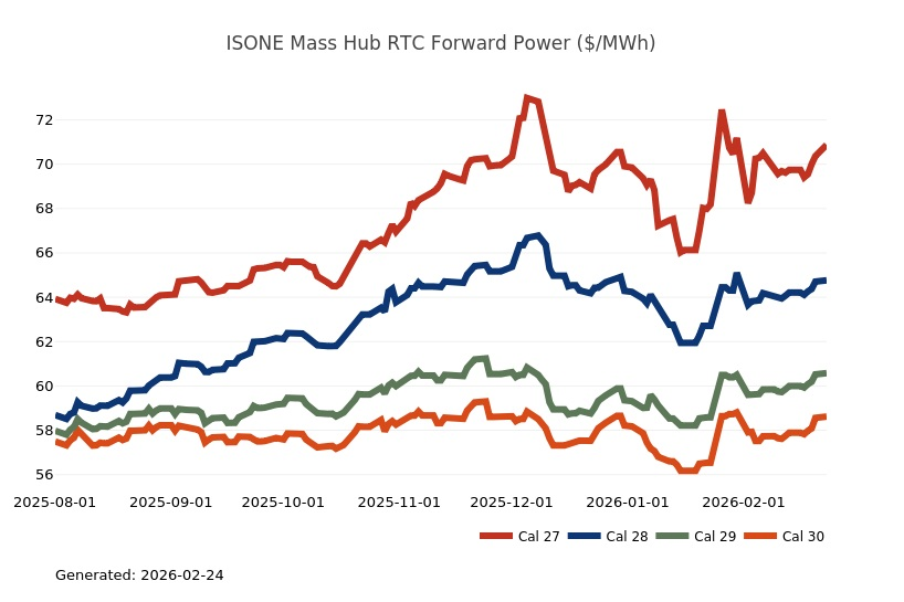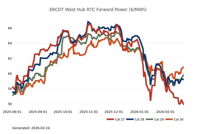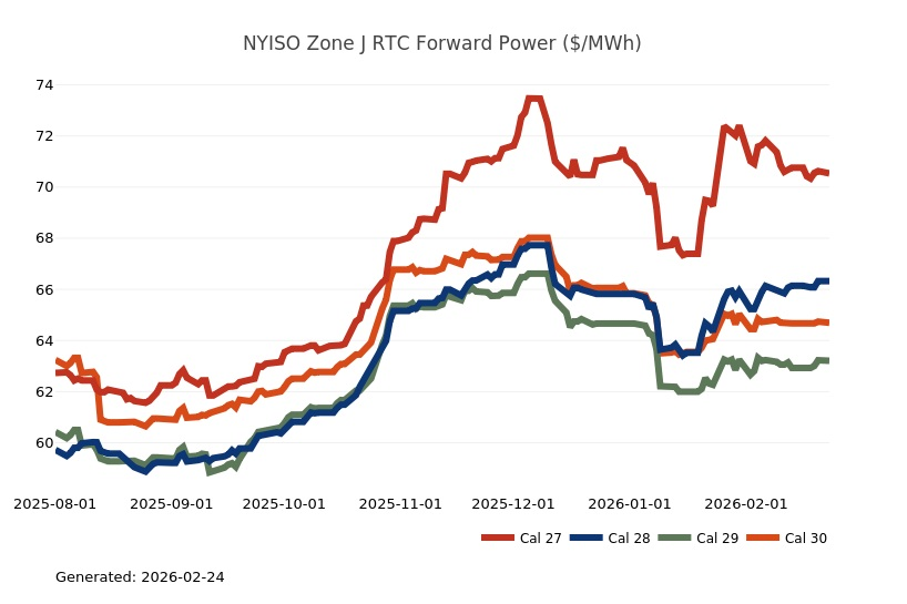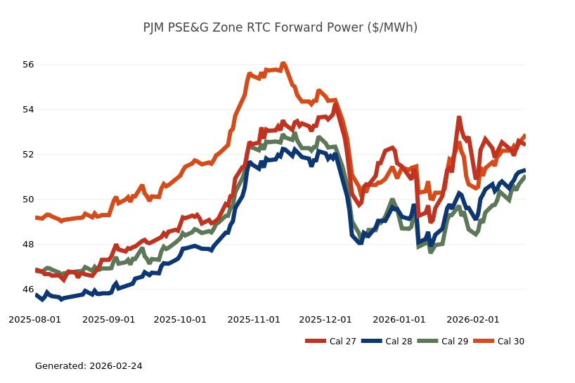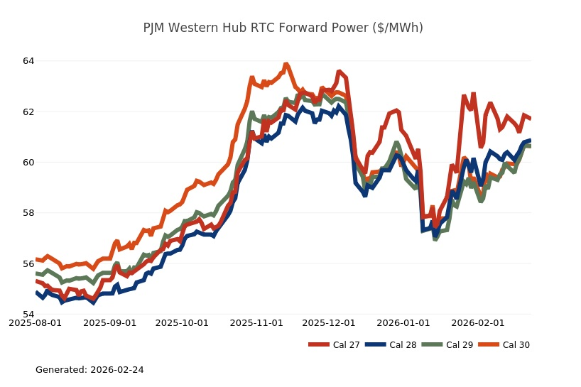 - The Mid-Atlantic Region’s forward power prices were relatively unchanged over the past week, with a slightly lower price for the balance of 2026, but some price support on the back end of the price curve. NYMEX natural gas futures jumped late Friday after trading in a tight range, as colder U.S. weather model revisions sparked buying. On Monday, natural gas prices saw some initial gains due to a winter storm but eventually pulled back as traders reassessed heating demand against ample supply. Beyond the next few days, we had an increase in heating demand, as variability in the weather pattern allows for periods of below-normal temperatures from the Midwest to the East Coast. One such event is expected early next week, however, a lack of blocking in the pattern means this will only last for a few days. Forward power prices for the 2026-2030 terms over the past week were unchanged on average, with a -1% decrease for the balance of 2026 and a 1% increase for the 2028-2030 terms. The month-to-date, day-ahead settlement price average in West Hub for February is $98.93/MWh or is -36% lower than January’s final settlement price last month.