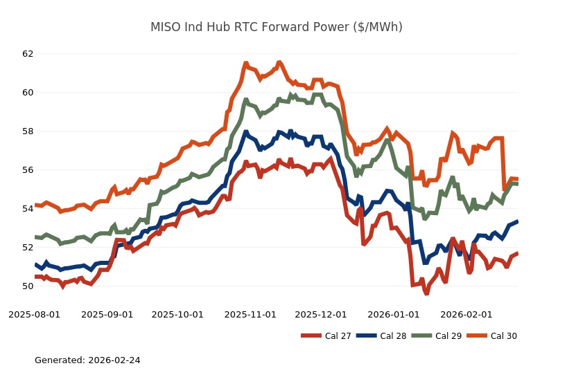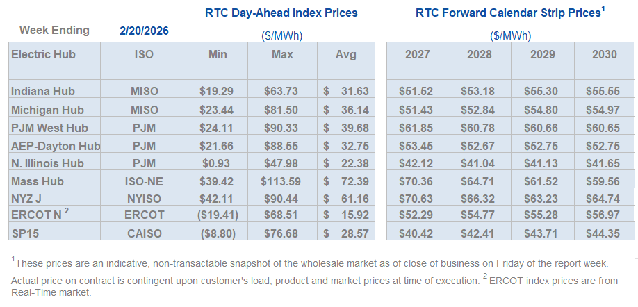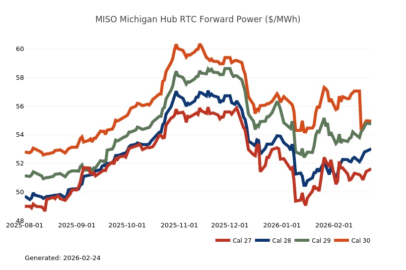 - The Great Lakes Region’s forward power prices were higher over the past week. NYMEX natural gas futures jumped late Friday after trading in a tight range, as colder U.S. weather model revisions sparked buying. On Monday, natural gas prices saw some initial gains due to a winter storm but eventually pulled back as traders reassessed heating demand against ample supply. Beyond the next few days, we had an increase in heating demand, as variability in the weather pattern allows for periods of below-normal temperatures from the Midwest to the East Coast. One such event is expected early next week, however, a lack of blocking in the pattern means this will only last for a few days. Forward power prices for the 2026-2030 terms over the past week were 2% higher, on average, and were between 1-2% higher for any of the years in the strip. The month-to-date, day-ahead settlement price average in COMED for February is $40.30/MWh or is -52% lower than last month’s average, while in AdHub that average price is $68.52/MWh or is -34% lower than the previous month. In Michigan, that month-to-date average for February thus far is $56.82/MWh or is -42% lower than last month, while in Ameren the average price thus far is $46.09/MWh or is -50% lower than January’s average.