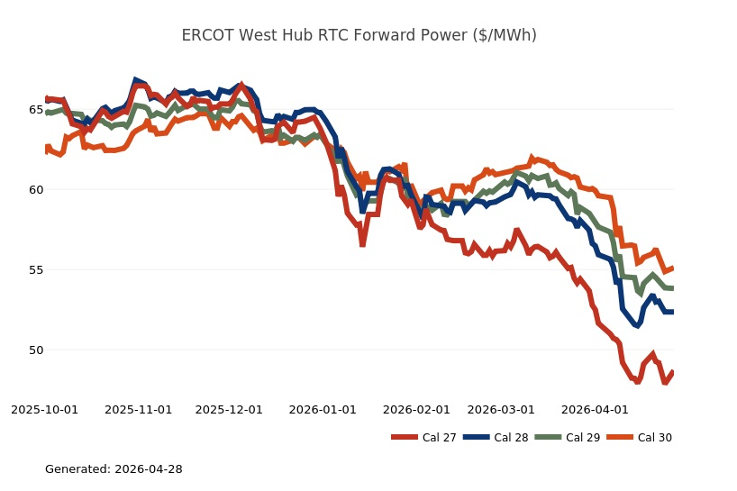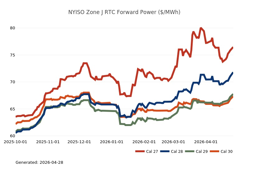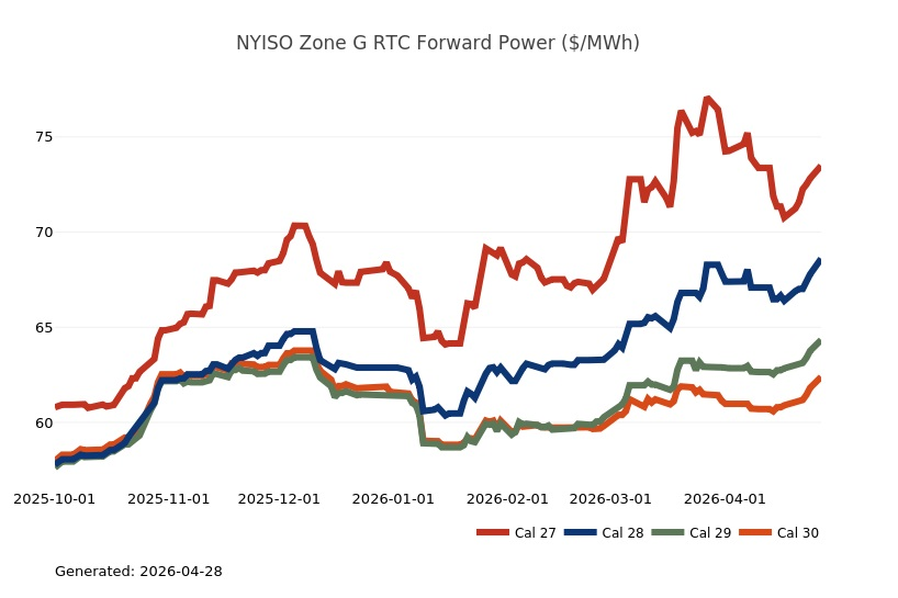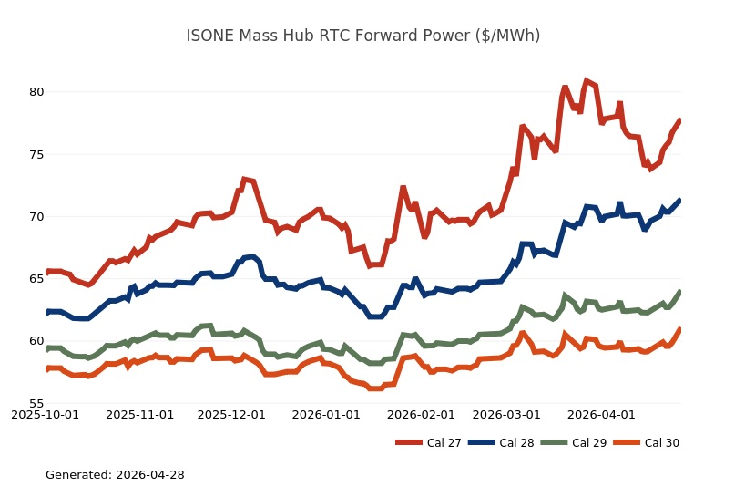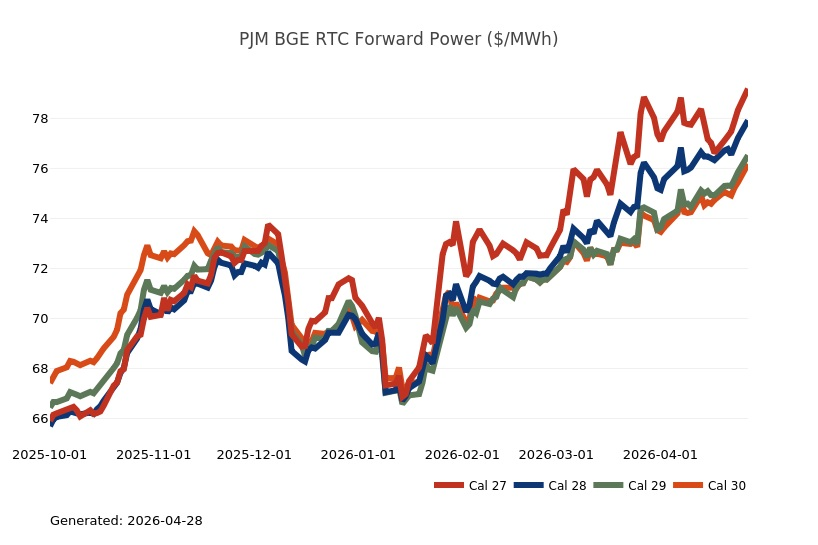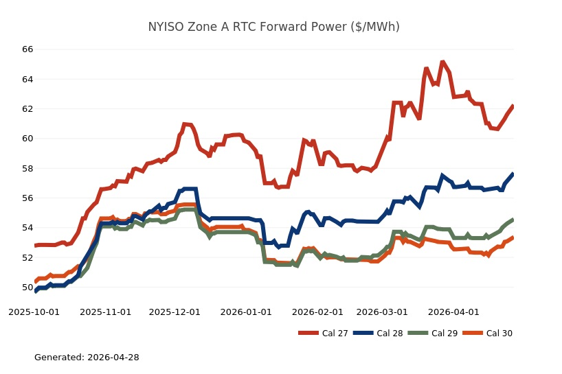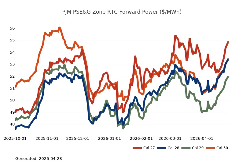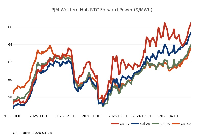 - The Mid-Atlantic Region’s forward power prices were higher on the week, despite the seasonal softness in natural gas prices. May NYMEX natural gas extended losses Friday, deepening a storage-driven sell-off as mild weather and swelling supplies pressured the contract in its final days as the prompt month, despite record high LNG exports. We saw cooler changes to the weather forecast over the weekend model runs. Severe weather season is peaking across the central United States over the next few days, as warm air moving up from the South clashes with Canada’s number one export. A strong cold front will move across the eastern half of the nation late this week, bringing another round of chilly air over the weekend. The forward electricity prices for the 2027-2030 strips were 2% higher, on average, over the past week with more support for the near terms than the outer terms. The month-to-date, day-ahead settlement price average for April, in West Hub, is $51.92/MWh or 9% higher than last month’s final settlement price average.
