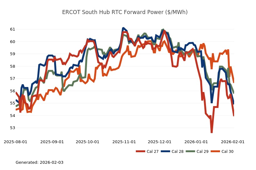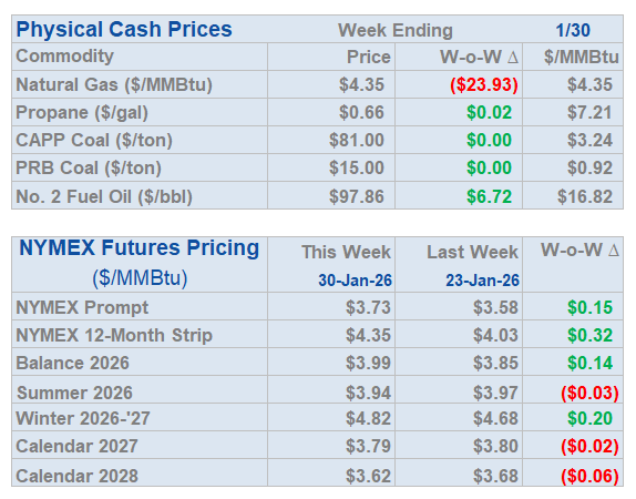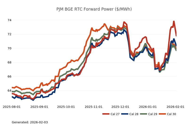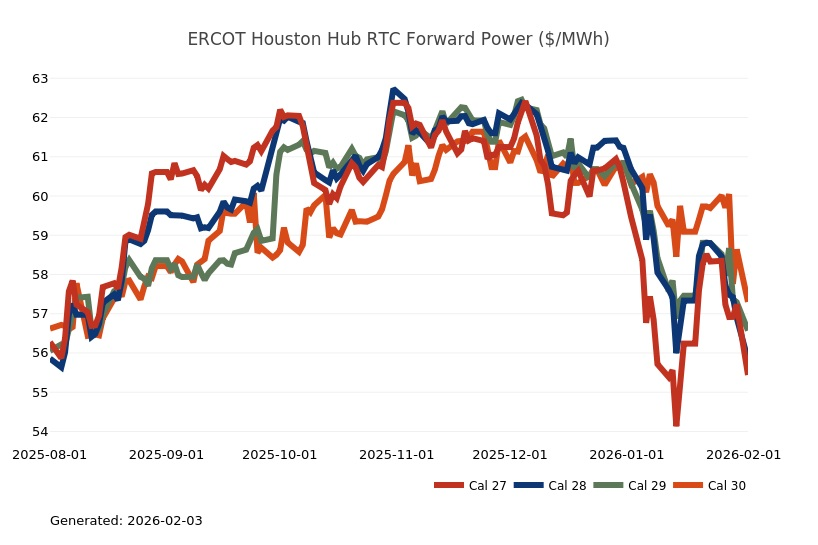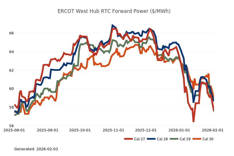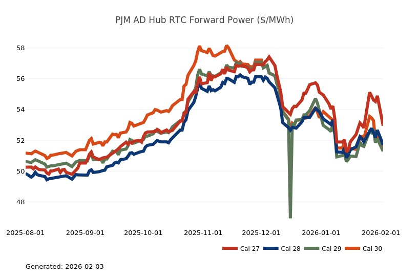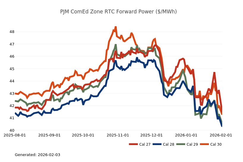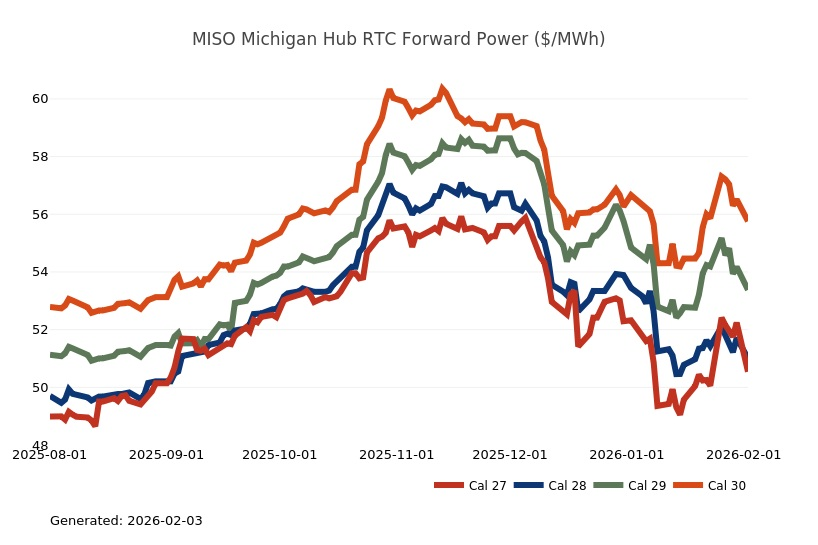 - The Great Lakes Region’s forward power prices were higher on the week, particularly in the near term, as January cold started to provide significant uplift to those terms. March Nymex natural gas futures were up 20% on the week on tight supply and stubborn cold. Shrinking inventories, lingering production freeze-offs and hints of a possible mid-February cold shot fueled impressive gains for natural gas futures on Friday. Conversely, Monday natural gas futures plummeted by more than 25% as the market focused on milder temperature forecasts and production recovering from freeze-offs. Forward power prices for the 2026-2030 terms, last week, were 2% higher with a 5% increase for the balance of 2026 and only a slight 1% increase on the back end of the price curve for 2027-2030. The month-to-date, day-ahead settlement price average in COMED for February is currently $73.11/MWh, while in AdHub it is $140.69/MWh for the month. In Michigan, thus far, the day ahead index average for this month is $115.86/MWh, while in Ameren the index price is averaging $91.16/MWh. Final settlement prices for January are still pending.