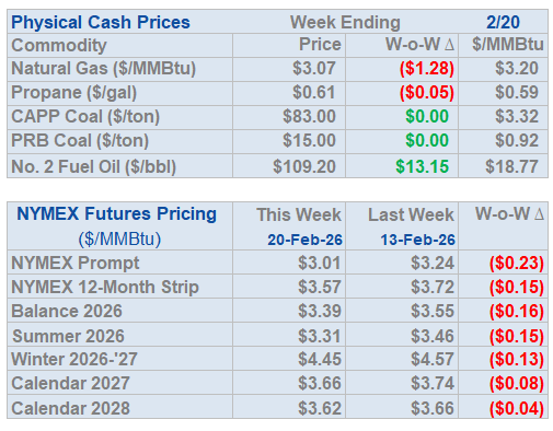 - Prompt month (March 2026) natural gas settled at $2.99/MMbtu, down $.06 on Monday, February 23.