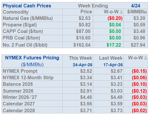 - Prompt month natural gas settled at $2.55/MMbtu, up $.03 on Monday, April 27.