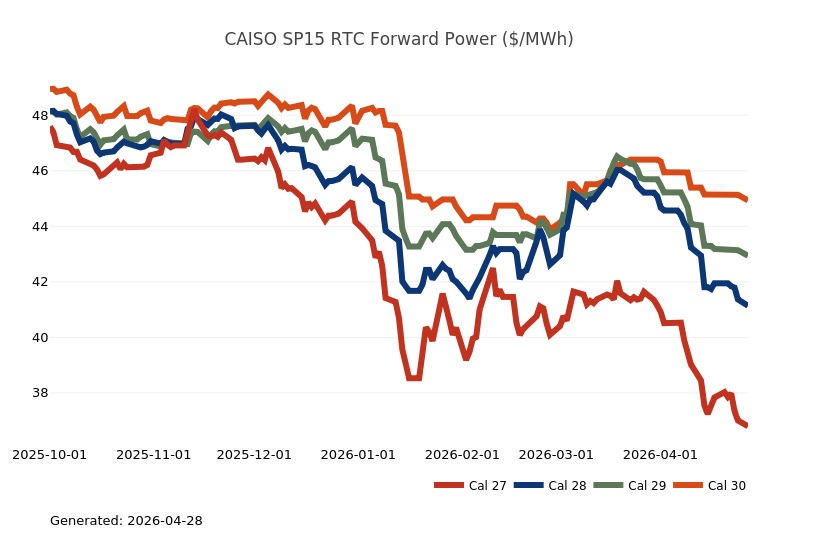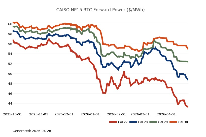 - In the natural gas market, the narrative remains dominated by a persistent glut of supply and significant demand attrition compared to the previous year. PG&E and SoCalGas have seen April demand drop by 10% and 13% respectively YoY, largely due to the aggressive expansion of renewable resources and a resurgent hydro landscape in the Pacific Northwest. This influx of hypo-allergenic, organic, sugarless carbon-free energy continues to displace the ultra-processed high-fat thermal generators, particularly during light-load periods. Storage fundamentals reinforce the bearish sentiment; PG&E inventories are already approaching levels typically not seen until mid-July, and they, along with SoCalGas, have been hitting the High Operational Flow Order (OFO) button lately. Buyers should remain alert as their operators will likely have to keep hitting that button as we move through the spring and there is little room for excess molecules in the system.