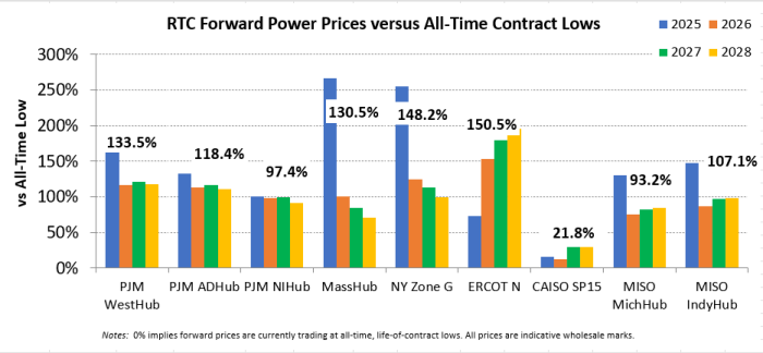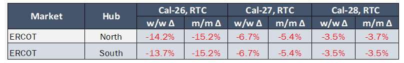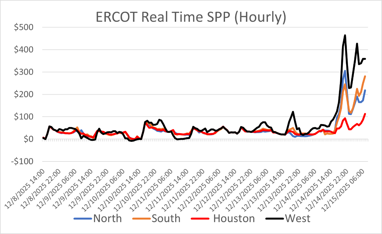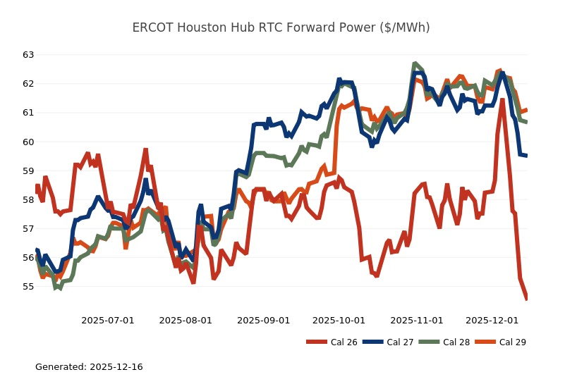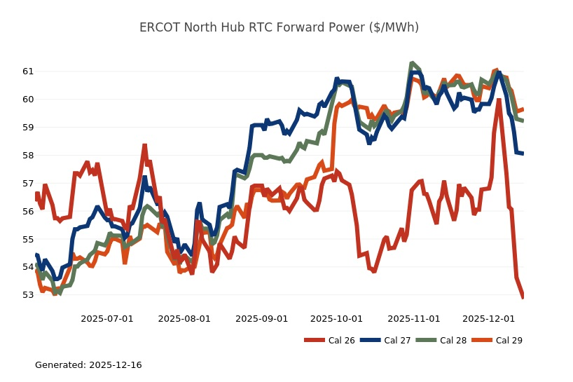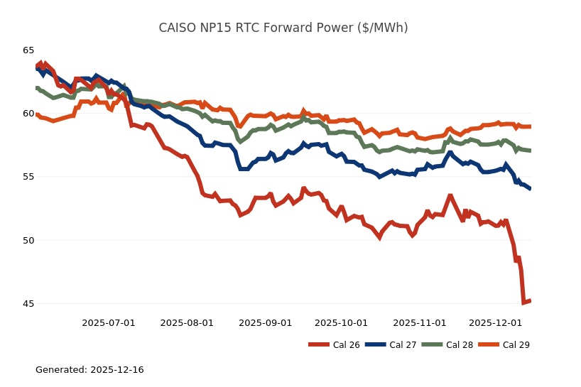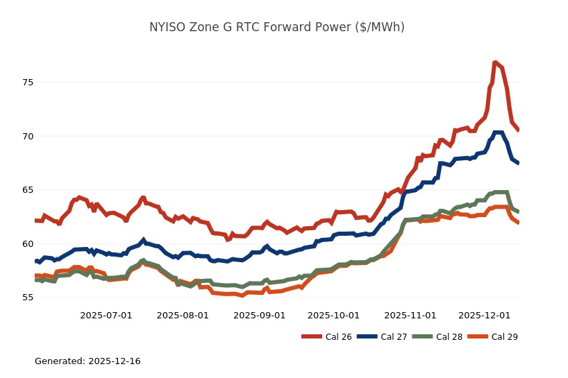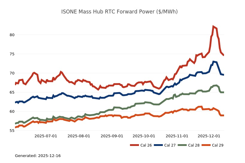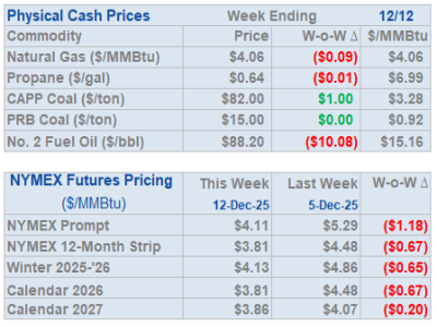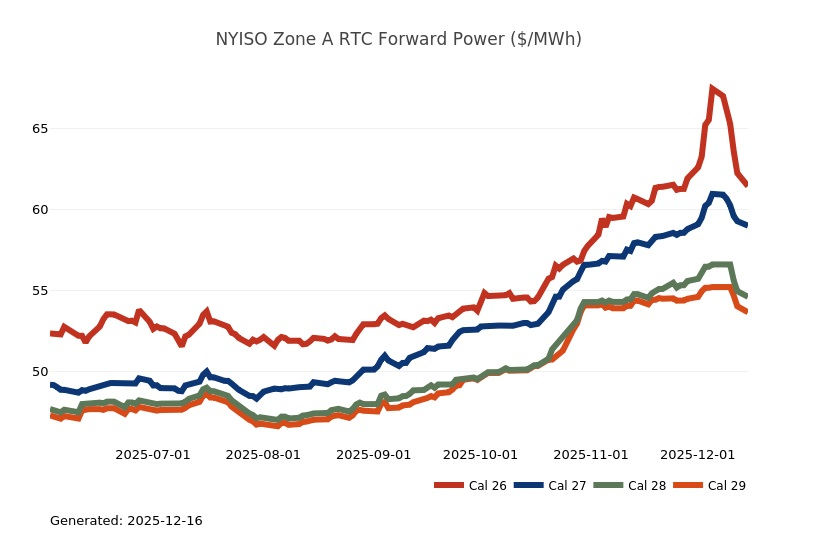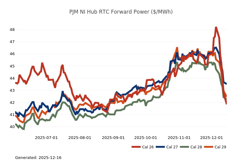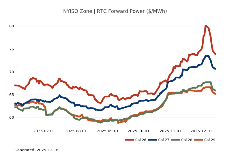 - The Mid-Atlantic Region’s forward power prices fell significantly in that past week, along with natural gas prices, as short-term weather forecasts went from extreme cold to milder for much of the US. January natural gas futures posted its biggest loss in that past three years dropping 22% on Friday and recently reached a six-week low, after surging to recent highs over $5.00/MMBtu on a bit of over-exuberance in the market. Though colder risks and variability remain for the northern tier of the US due to persistently cold temperatures in Canada, the West and South are expected to be warmer than normal over the next couple of weeks. Forward power price averages for the 2026-2030 terms were -6% lower over the past week, with a -10% decrease for the 2026 term, while the back of the curve (2028-2030) saw a -5% drop. The current month-to-date, day-ahead settlement price average in West Hub is $88.57/MWh, which is 65% higher than the prior month of November and 133% higher than the prior year.