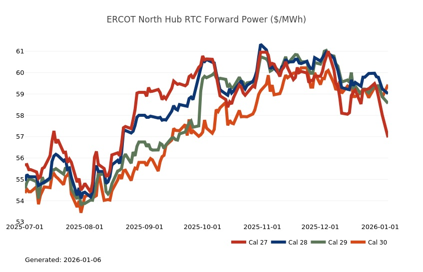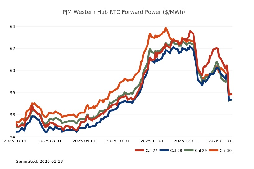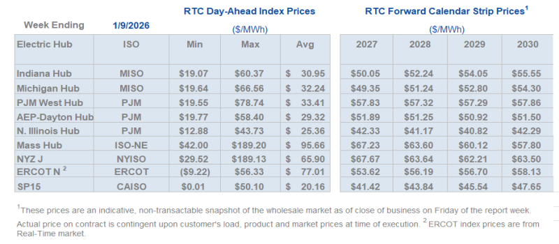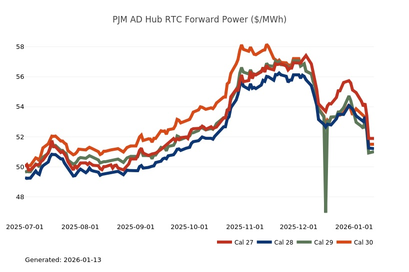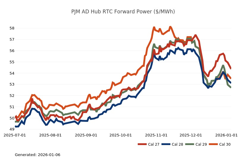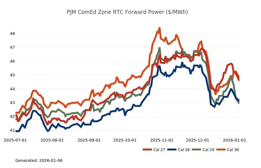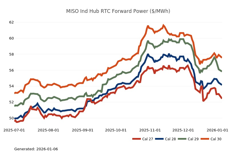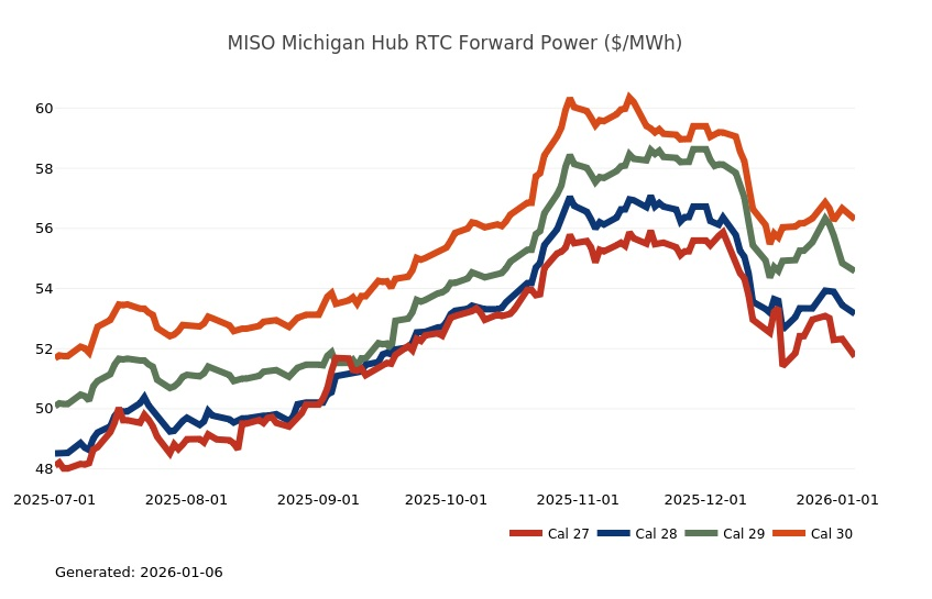 - The Great Lakes Region’s forward power prices fell significantly over the past month, along with natural gas prices, as the market went from dealing with one of the colder starts to December in years to where it is now with current forecasts continuing to shed heating demand over the next couple of weeks due to warmer than normal temperatures. US natural gas futures recently extended its losing streak for the fourth straight session, reaching its lowest price level since late October. Weather models experienced a double-digit loss in heating demand over the weekend, as cold air is in short supply this week, with much above normal to strong above normal temperatures expected across a large portion of the nation. Forward power prices over the past month for the 2026-2030 terms were -6% lower, on average, with a -10% decrease on the front of the price curve and a -6% decrease on the back of the curve (2029-2030). The final, day-ahead settlement price average in COMED for December 2025 was $40.40/MWh or was 9% higher than the prior month of November, while the final price in AdHub for the month was $49.41/MWh or was 4% higher than in November. In Michigan the final monthly settlement price for December averaged $49.37/MWh. or was 18% higher vs. November, while the final settlement price in Ameren averaged $43.69/MWh, or was 16% higher than November.