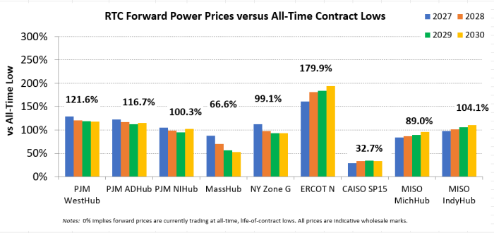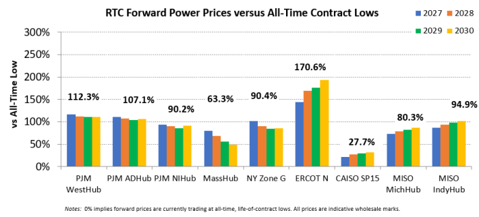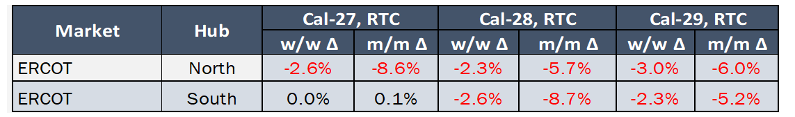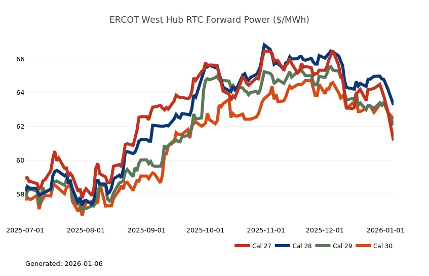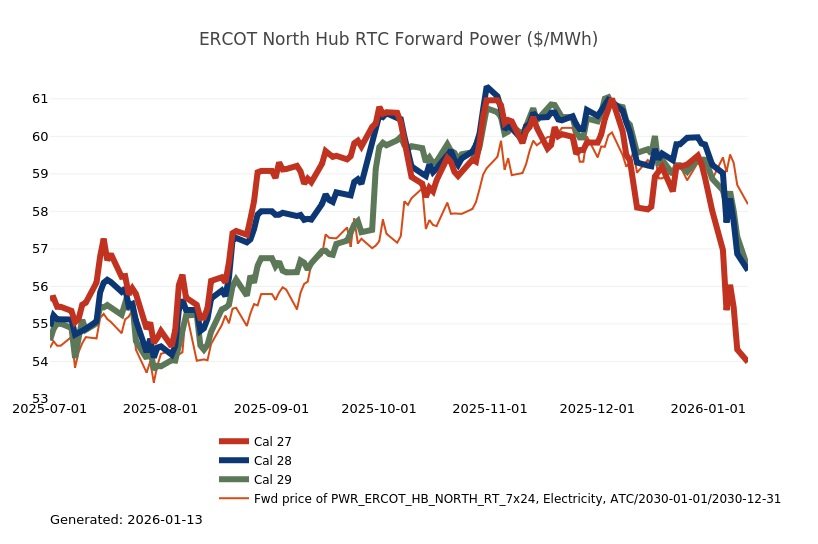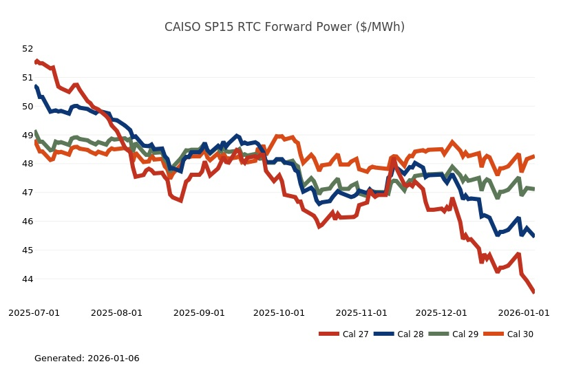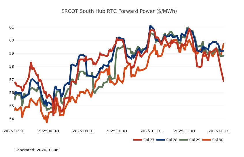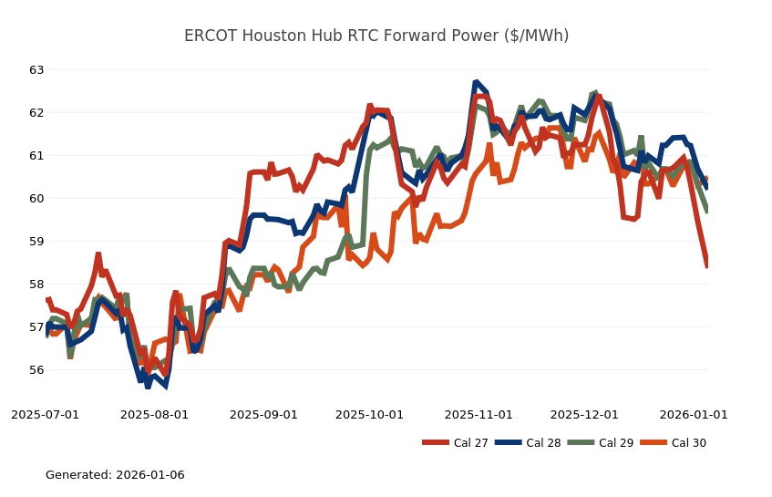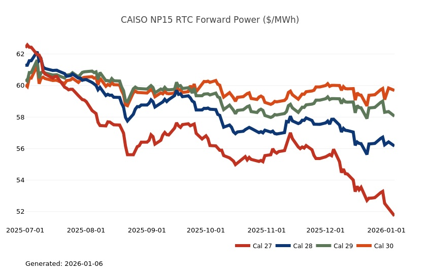 - The Great Lakes Region’s forward power prices fell significantly over the past month, along with natural gas prices, as the market went from dealing with one of the colder starts to December in years to where it is now with current forecasts continuing to shed heating demand over the next couple of weeks due to warmer than normal temperatures. US natural gas futures recently extended its losing streak for the fourth straight session, reaching its lowest price level since late October. Weather models experienced a double-digit loss in heating demand over the weekend, as cold air is in short supply this week, with much above normal to strong above normal temperatures expected across a large portion of the nation. Forward power prices over the past month for the 2026-2030 terms were -6% lower, on average, with a -10% decrease on the front of the price curve and a -6% decrease on the back of the curve (2029-2030). The final, day-ahead settlement price average in COMED for December 2025 was $40.40/MWh or was 9% higher than the prior month of November, while the final price in AdHub for the month was $49.41/MWh or was 4% higher than in November. In Michigan the final monthly settlement price for December averaged $49.37/MWh. or was 18% higher vs. November, while the final settlement price in Ameren averaged $43.69/MWh, or was 16% higher than November.