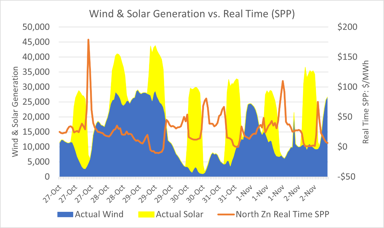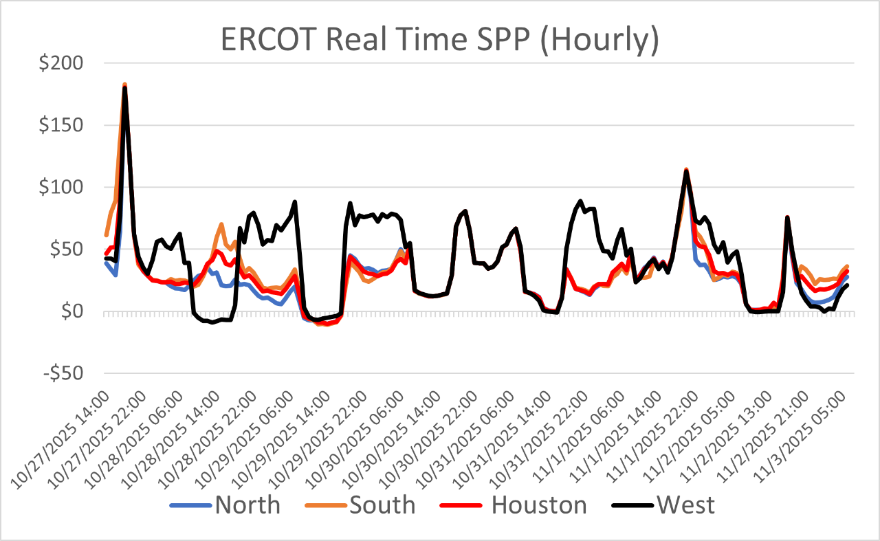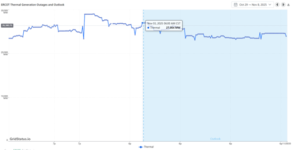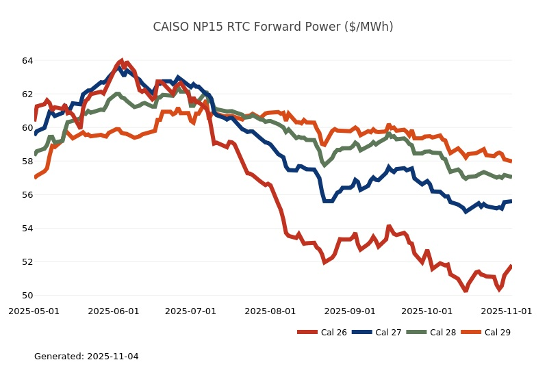 - There are some indications in the weather outlook that suggest an increase in heating demand by mid-month which will be the first test of the natural gas grid for winter demand. One advantage CAISO dispatchers have this year is an increase in battery capacity that has risen from 12 GW in late 2024 and is expected to hit 15.5 GW by the end of this year. As a data point, the growth in storage has been matched by the steady expansion of behind-the-meter solar; within CAISO the grid has averaged 140 MW of new build each month over the last couple of years.