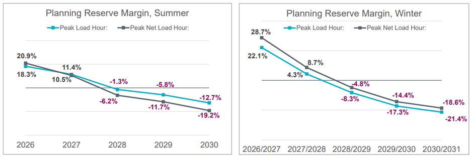 - PJM 2027/28 BRA Clears at the Cap but Falls Short of Target Reserve Margin - On 12/17, PJM announced the results of the 2027/28 Base Residual Auction (BRA). This was the second and final auction run under a price cap and floor implemented in response to a complaint by PA Governor Shapiro. The price cleared at the cap of $333.34/MW-day across the RTO. However, PJM failed to meet its target reserve margin clearing 6,623.2 MW UCAP below the RTO Reliability Requirement. PJM reported the auction cleared at a 14.8% Installed Reserve margin (IRM), 5.2 percentage points below the 20% target IRM. Under current rules, a shortfall greater than 1% for two additional BRAs will trigger a Reliability Backstop Auction. The resulting shortfall does trigger an investigation into the deficit and PJM will likely provide an update in January 2026 for stakeholder consideration. PJM also simulated auction results had the cap and floor not been in place. Prices would have cleared at $529.80/MW-day for the RTO with Dominion separating and clearing $542.83/MW-day (a $13.03 premium). Without the cap, the total reserve margin would have been 15.4%.