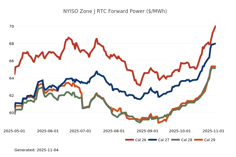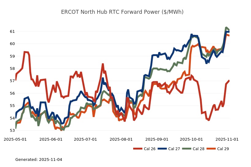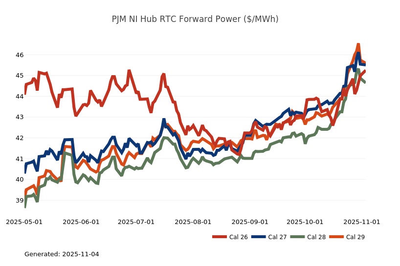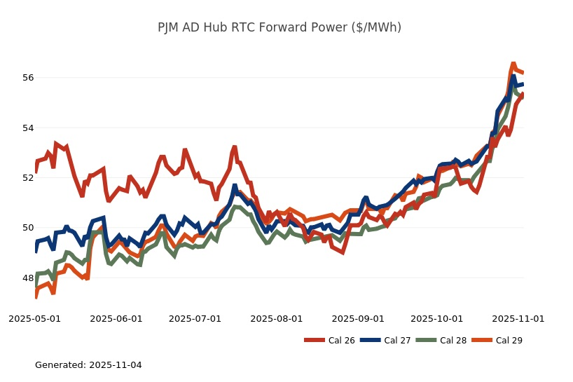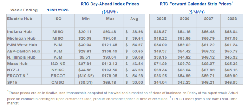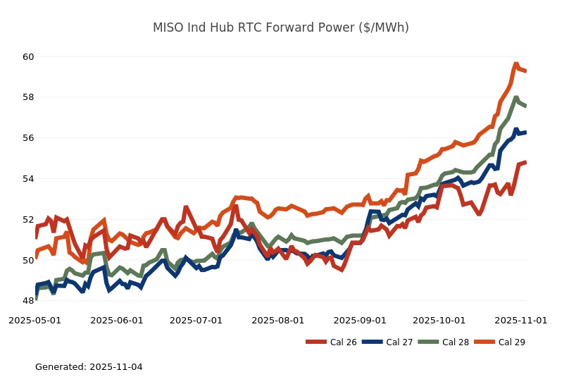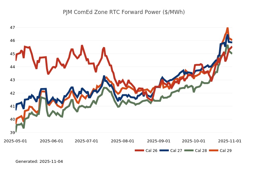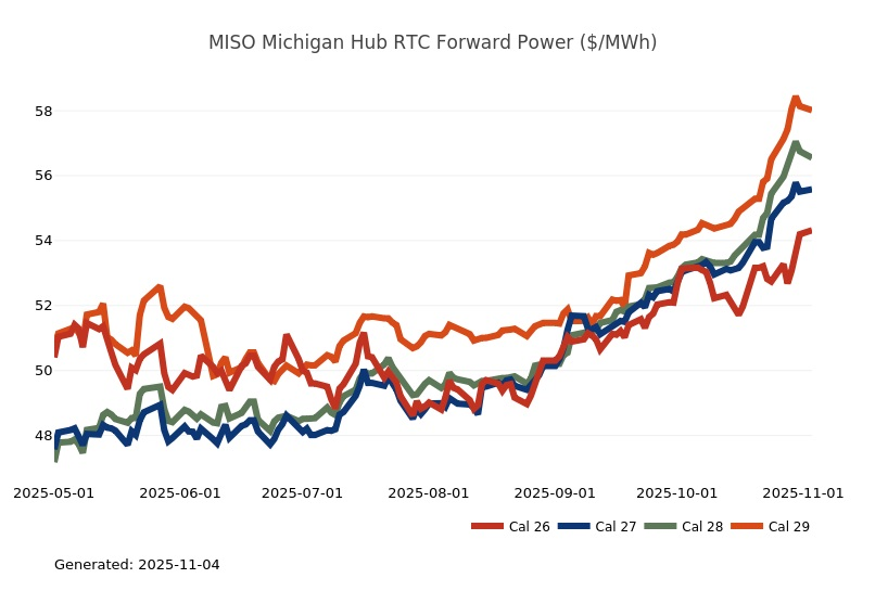 - The Great Lakes Region’s forward power prices continue to find price support from cooler weather forecasts despite consistently bearish drivers like strong production and natural gas storage inventory surpluses. Natural gas futures went above a 7-month high on Monday and has rallied higher for the past four sessions. The market seems to be looking past the slow start to winter in November, to colder expectations in December. As has been the case over the past few months, the most persistent warmer-than-normal anomalies remain centered over the Plains and Rockies, with greater variability in the East and West. Over the weekend, there was an increase in heating degree days due to a stronger cold front expected to move across the eastern United States early next week. Forward power prices for the 2026-2030 terms were 2% higher, on average, week-over-week and 8% higher over the past month. The preliminary, day-ahead settlement price average in COMED for the month of October is $34.74/MWh, which is 6% lower than in September, while for AdHub that price is $48.75/MWh, which is 23% higher than the prior month. In Michigan the preliminary, day-ahead settlement price average is $39.97/MWh which is right on par with September’s price, while in Ameren the settlement price of $35.16/MWh is -9% lower than it was the prior month.