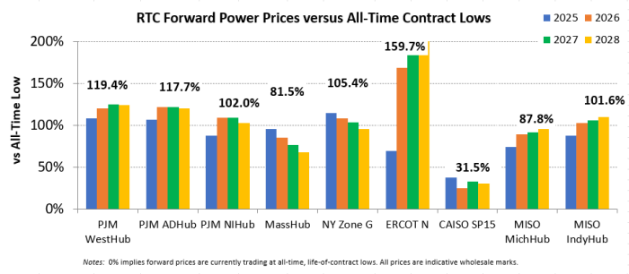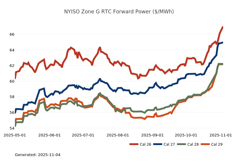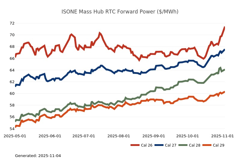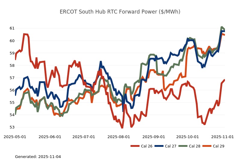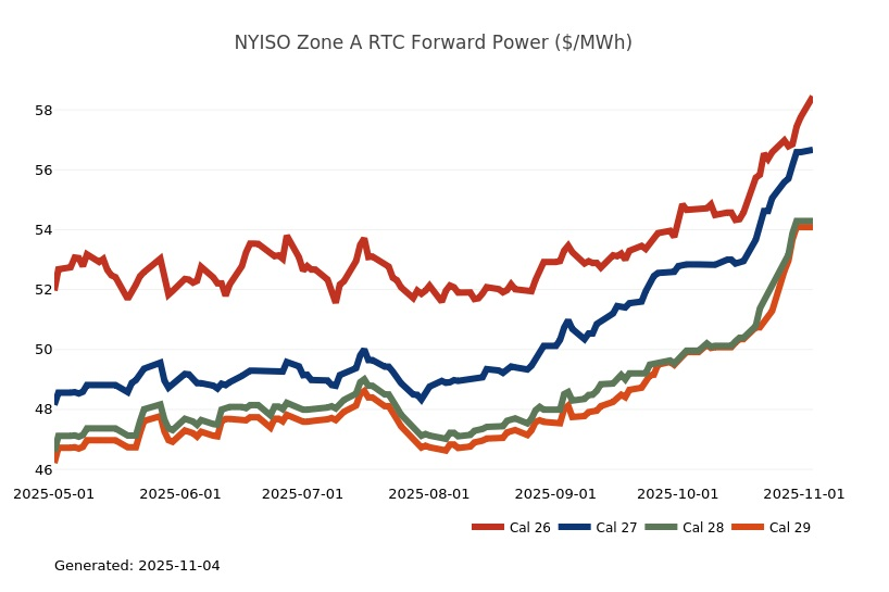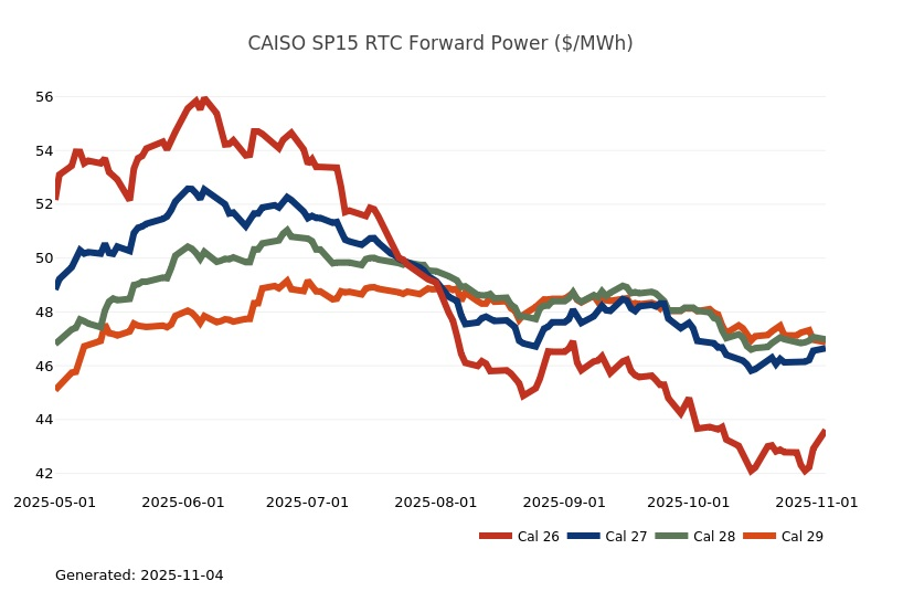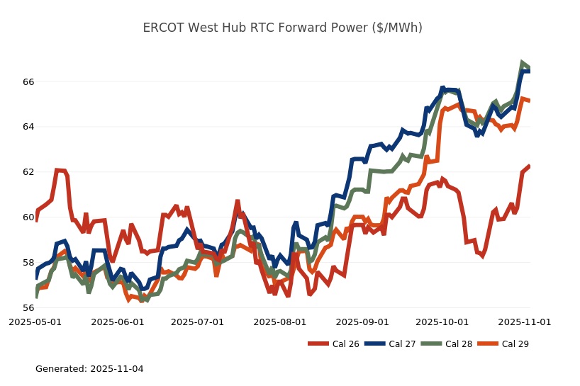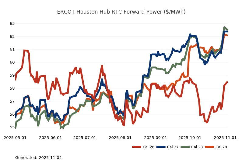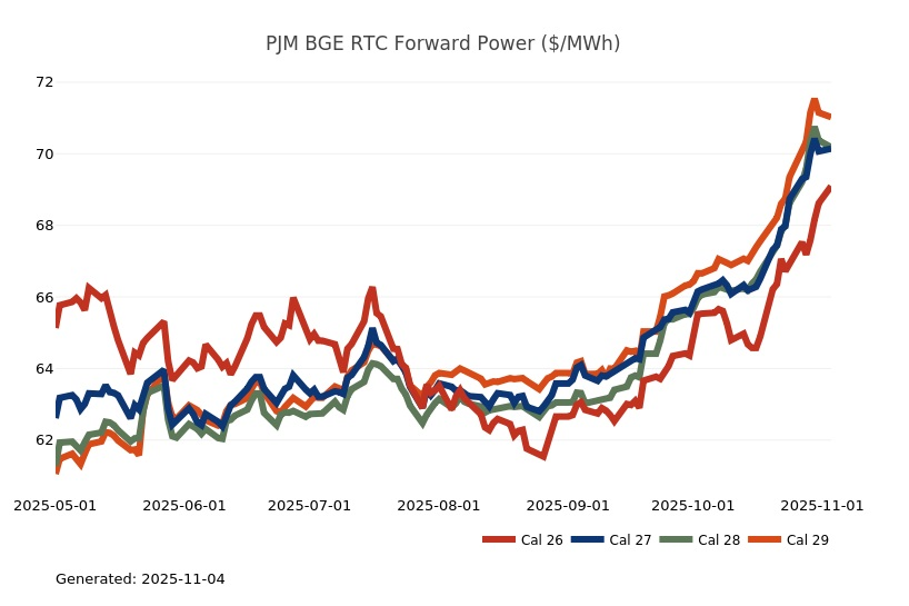 - The Great Lakes Region’s forward power prices continue to find price support from cooler weather forecasts despite consistently bearish drivers like strong production and natural gas storage inventory surpluses. Natural gas futures went above a 7-month high on Monday and has rallied higher for the past four sessions. The market seems to be looking past the slow start to winter in November, to colder expectations in December. As has been the case over the past few months, the most persistent warmer-than-normal anomalies remain centered over the Plains and Rockies, with greater variability in the East and West. Over the weekend, there was an increase in heating degree days due to a stronger cold front expected to move across the eastern United States early next week. Forward power prices for the 2026-2030 terms were 2% higher, on average, week-over-week and 8% higher over the past month. The preliminary, day-ahead settlement price average in COMED for the month of October is $34.74/MWh, which is 6% lower than in September, while for AdHub that price is $48.75/MWh, which is 23% higher than the prior month. In Michigan the preliminary, day-ahead settlement price average is $39.97/MWh which is right on par with September’s price, while in Ameren the settlement price of $35.16/MWh is -9% lower than it was the prior month.