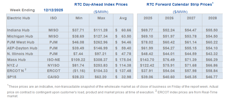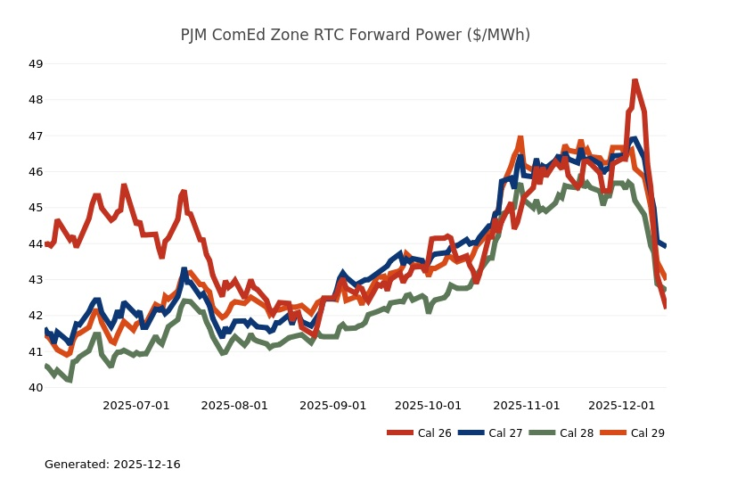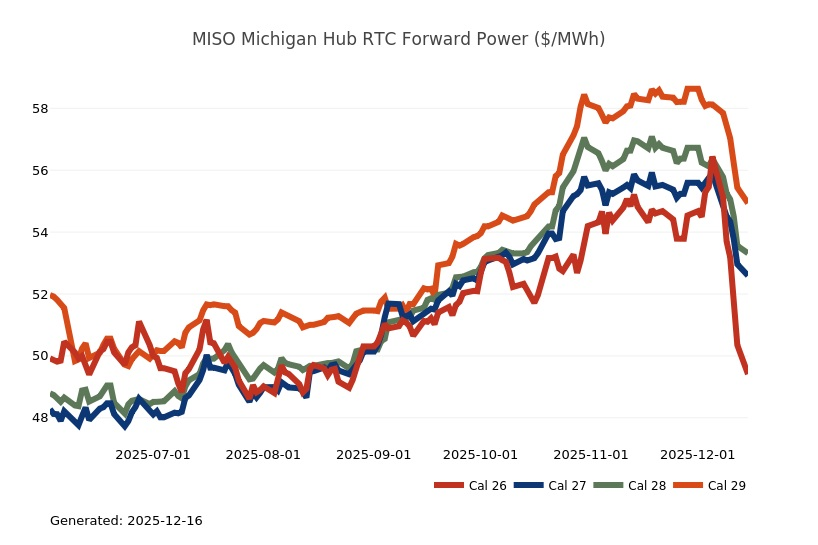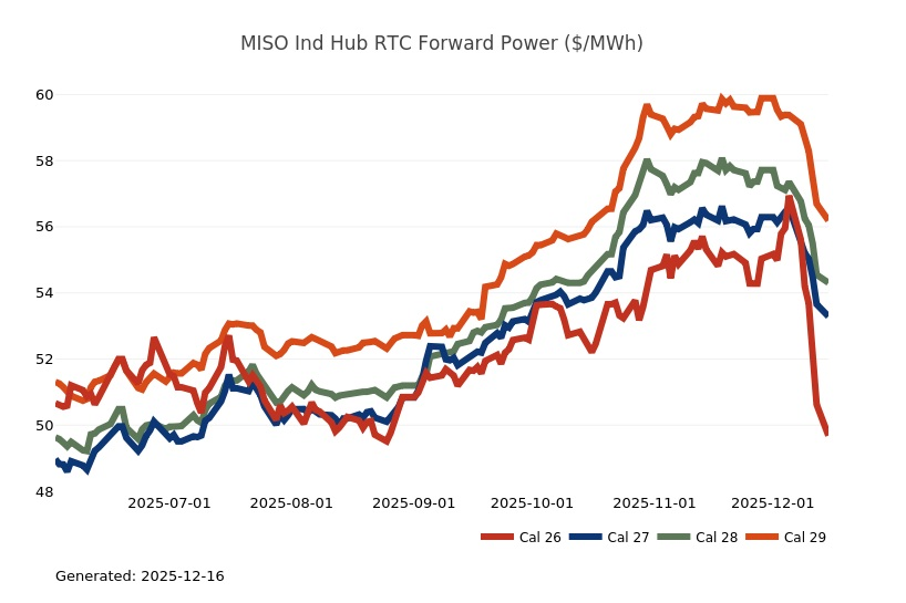 - The Great Lakes Region’s forward power prices fell significantly in that past week, along with natural gas prices, as short-term weather forecasts went from extreme cold to milder for much of the US. January natural gas futures posted its biggest loss in that past three years dropping 22% on Friday and recently reached a six-week low, after surging to recent highs over $5.00/MMBtu on a bit of over-exuberance in the market. Though colder risks and variability remain for the northern tier of the US due to persistently cold temperatures in Canada, the West and South are expected to be warmer than normal over the next couple of weeks. Forward power price averages, for the 2026-2030 terms, were -6% lower over the past week with a -10% decrease for the 2026 term and a -4% drop on the back of the curve for the 2028-2030 terms. The month-to-date, day-ahead settlement price average in COMED is $51.56/MWh or 40% higher than last month, while the month-to-date average price in AdHub is $61.14/MWh or 29% higher than November. In Michigan those same month-to-date prices are averaging $62.29/MWh or 49% higher vs. the prior month, while the settlement prices in Ameren are averaging $56.54/MWh, which is 50% higher than last month.