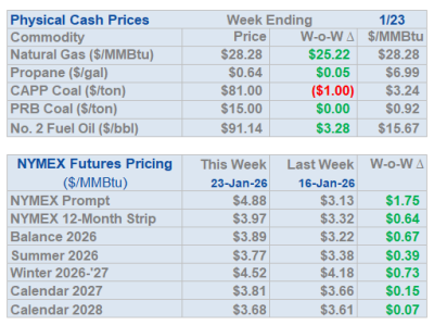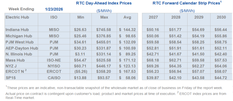 - The Great Lakes Region’s forward power prices were higher on the week, particularly in the near terms, as the January cold started to provide significant price uplift. NYMEX futures surged over 90% since last week, due to the Arctic blast that the eastern 2/3 of the country is experiencing and the resulting decline in natural gas production associated with the gas well freeze-offs. The weekend storm has moved off the East Coast, followed by a fresh surge of Arctic air from Canada. This will result in a very cold week across the eastern half of the nation. There will be a brief easing in the severity of the cold in the middle of the week before another cold front and Arctic high usher in a new wave of frigid air later this week and into the weekend. Forward power prices for the 2026-2030 terms, last week, were 4% higher with a 14% increase for the balance of 2026 and only a 1% increase on the back end of the price curve for 2027-2030. Expect prices for those terms to be higher over the next week. The month-to-date, day-ahead settlement price average in COMED for January is currently $72.83/MWh, which is 80% higher than the prior month of December’s final settlement price, while that current average for AdHub is $85.04/MWh, which is 72% higher than last month. In Michigan the current price average for January is $78.85/MWh which is 60% higher than last month, while in Ameren the average index price is $79.47/MWh, or 82% higher than last month's settle.