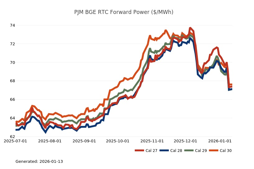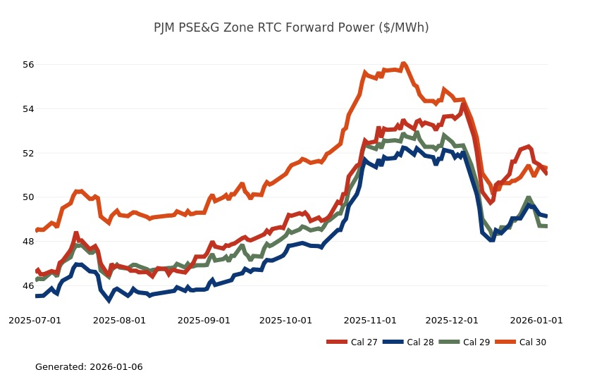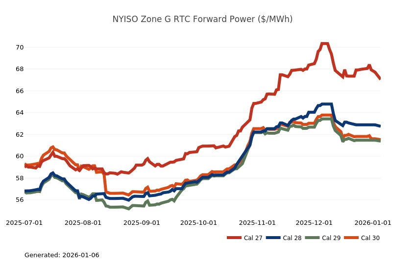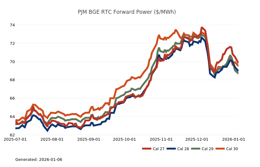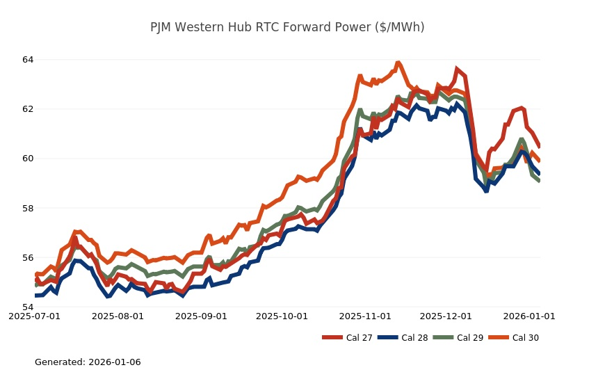 - The Mid-Atlantic Region’s forward power prices fell significantly over the past month, along with natural gas prices, as the market went from dealing with one of the colder starts to December in years to where it is now with current forecasts continuing to shed heating demand over the next couple of weeks due to warmer than normal temperatures. US natural gas futures recently extended its losing streak for the fourth straight session, reaching its lowest price level since late October. Weather models experienced a double-digit loss in heating demand over the weekend, as cold air is in short supply this week, with much above normal to strong above normal temperatures expected across a large portion of the nation. Forward power prices over the past month for the 2026-2030 terms were -7% lower, on average, with an -11% decrease on the front of the price curve and a -6% decrease on the back of the curve (2029-2030). The final, day-ahead settlement price average in West Hub for December 2025 was $68.70/MWh, which is $14.94/MWh or 28% higher than the prior month of November.