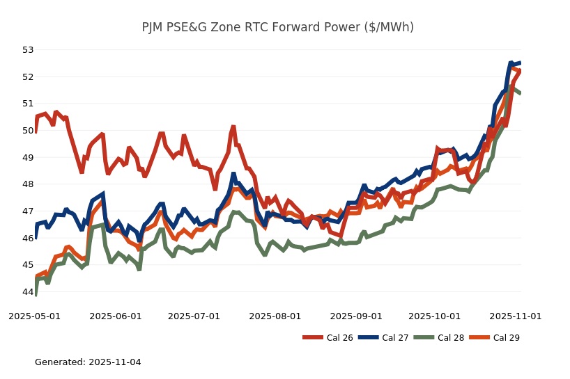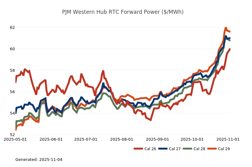 - The Mid-Atlantic Region’s forward power prices continue to find price support from cooler weather forecasts despite consistently bearish drivers like strong production and natural gas storage inventory surpluses. Natural gas futures went above a 7-month high on Monday and has rallied higher for the past four sessions. The market seems to be looking past the slow start to winter in November, to colder expectations in December. As has been the case over the past few months, the most persistent warmer-than-normal anomalies remain centered over the Plains and Rockies, with greater variability in the East and West. Over the weekend, there was an increase in heating degree days due to a stronger cold front expected to move across the eastern United States early next week. Forward power prices for the 2026-2030 terms were 3% higher, on average, week-over-week and 7% higher over the past month. The preliminary, day-ahead settlement price average in West Hub for the month of October is $51.08/MWh, which is 23% higher than last September's average and 44% higher than a year ago.
