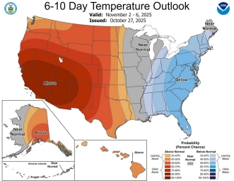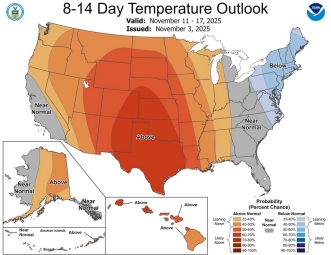 - Temperatures in the Midwest and Great Lakes Region will take a move down next week with lows in the upper 20s forecast for next Monday and Tuesday. Things warm up a bit by next Thursday. Generally, November is "seasonal" in many key consuming markets. Anomalies are not extreme but the first half of the month is trending "cooler" relative to the ten-year average.