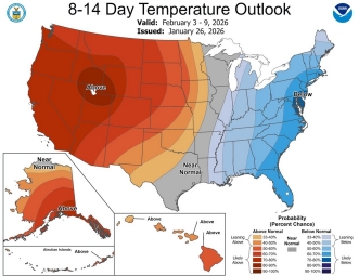 - The weekend storm that captivated the nation and drove grocery store sales to record highs has moved off the East Coast and was followed by a surge of Arctic air pouring down from the pole through Canada. The result is a very cold week across the eastern half of the nation with forecasts indicating the bitter cold will ease briefly before ramping back into the severe category with a new wave of frigid air late this week and into the weekend. Meanwhile out West, the forecasts are trending in the warmer direction to wrap up January and last through the first 10 days of February. By the end of the week, widespread above- to much-above normals will be seen across the forecast maps for the Western half of the nation. This warmer than normal pattern is shown to last into the second week of February as the colder air remains focused across the Eastern U.S. Forecasts like this reinforce that those living in California made good life choices.