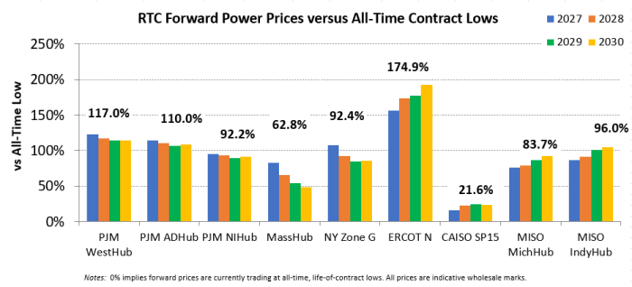 - The Mid-Atlantic Region’s forward power prices were higher on the week, particularly in the near terms, as the January cold started to provide significant uplift to those terms. NYMEX futures surged over 90% since last week, due to the Arctic blast that the eastern 2/3 of the country is experiencing and the resulting decline in natural gas production associated with the gas well freeze-offs. The weekend storm has moved off the East Coast, followed by a fresh surge of Arctic air from Canada. This will result in a very cold week across the eastern half of the nation. There will be a brief easing in the severity of the cold in the middle of the week before another cold front and Arctic high usher in a new wave of frigid air later this week and into the weekend. Forward power prices for the 2026-2030 terms were 5% higher last week, with a 15% increase for the balance of 2026 term and only a 2% increase on the back end of the price curve for 2027-2030 terms. Expect prices for those terms to be higher over the next week. The month-to-date, day-ahead settlement price average in West Hub for January is currently averaging $118.23/MWh, which is 72% higher than December’s final settlement price and 77% higher than January 2025.