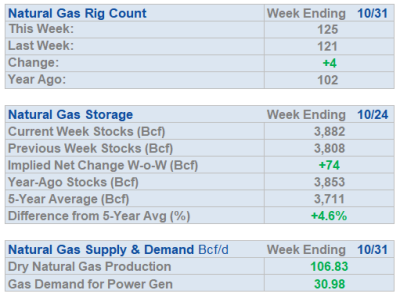 - Inventories of natural gas in underground storage for the week ending October 24 are 3,882 Bcf; an injection of 74 Bcf was reported for the week ending October 24.