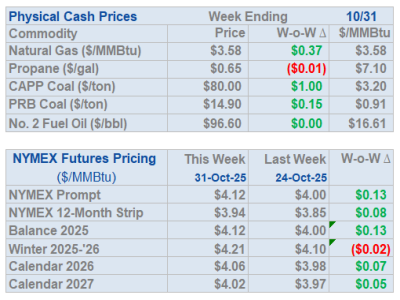- Prompt-month NYMEX natural gas settled at $4.27/MMbtu, up $.14 on Monday, November 3.