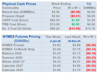 - Prompt month (Feb 2026) natural gas settled at $3.52/MMbtu, down $.10 on Monday, January 5.